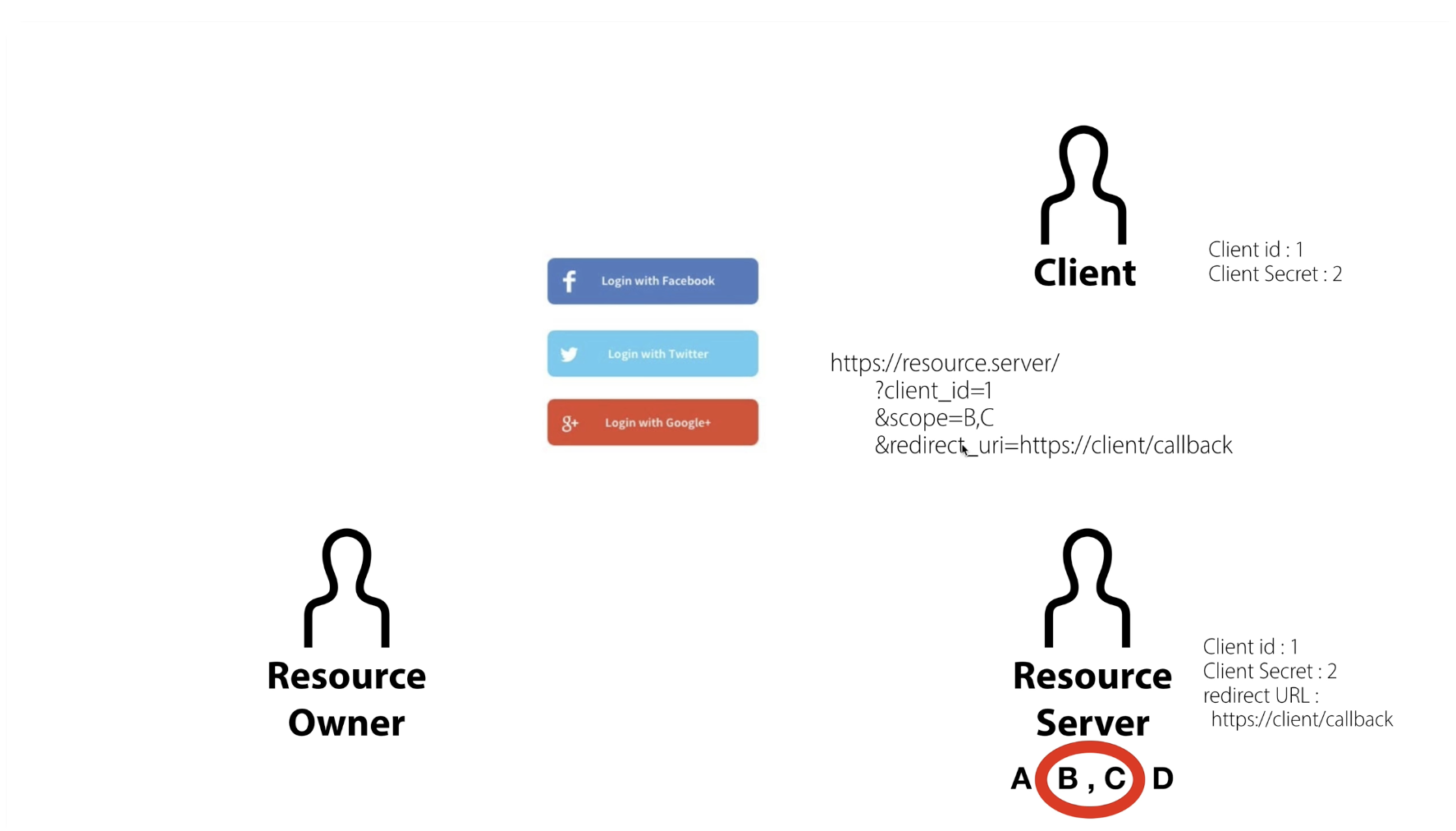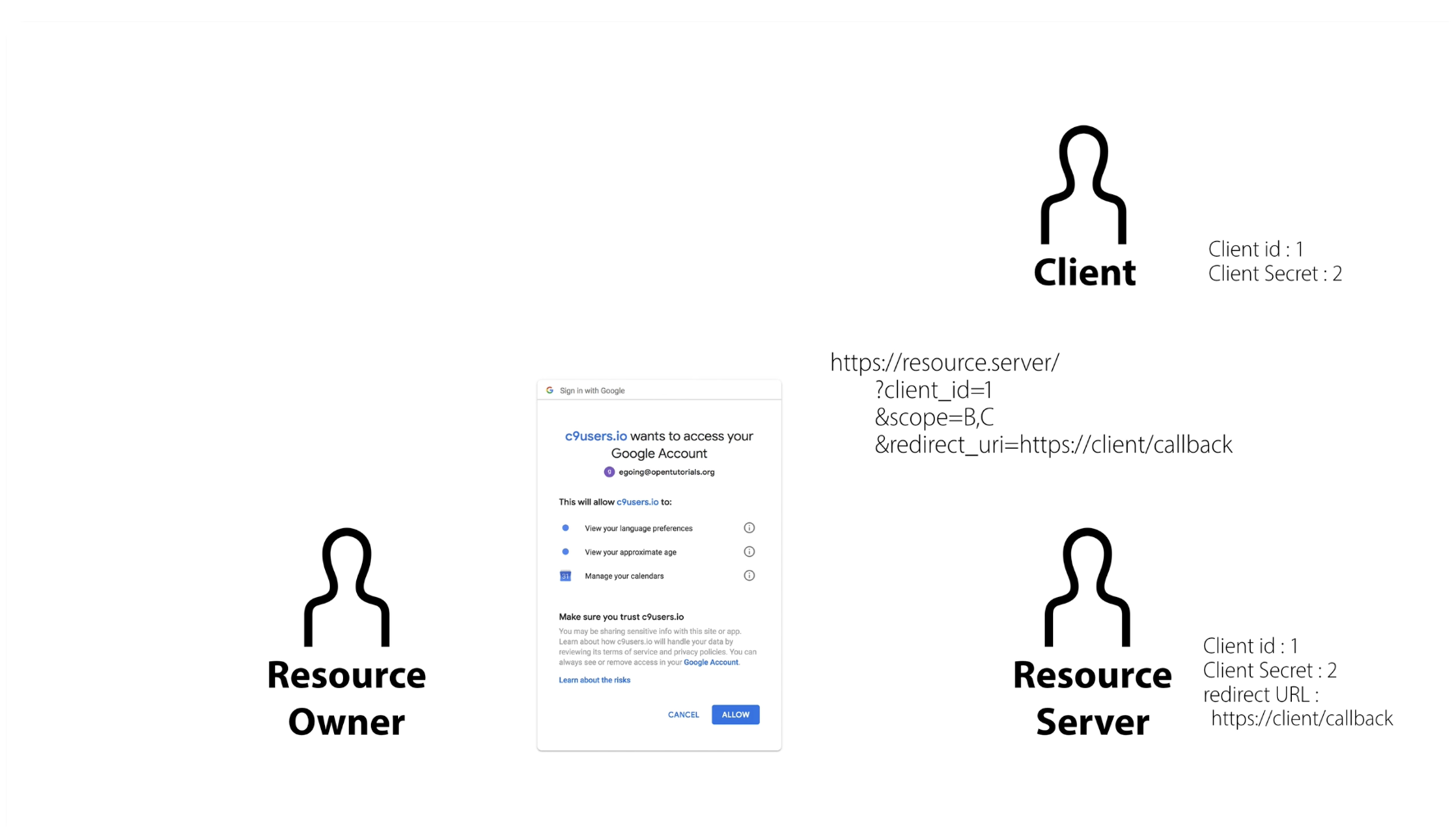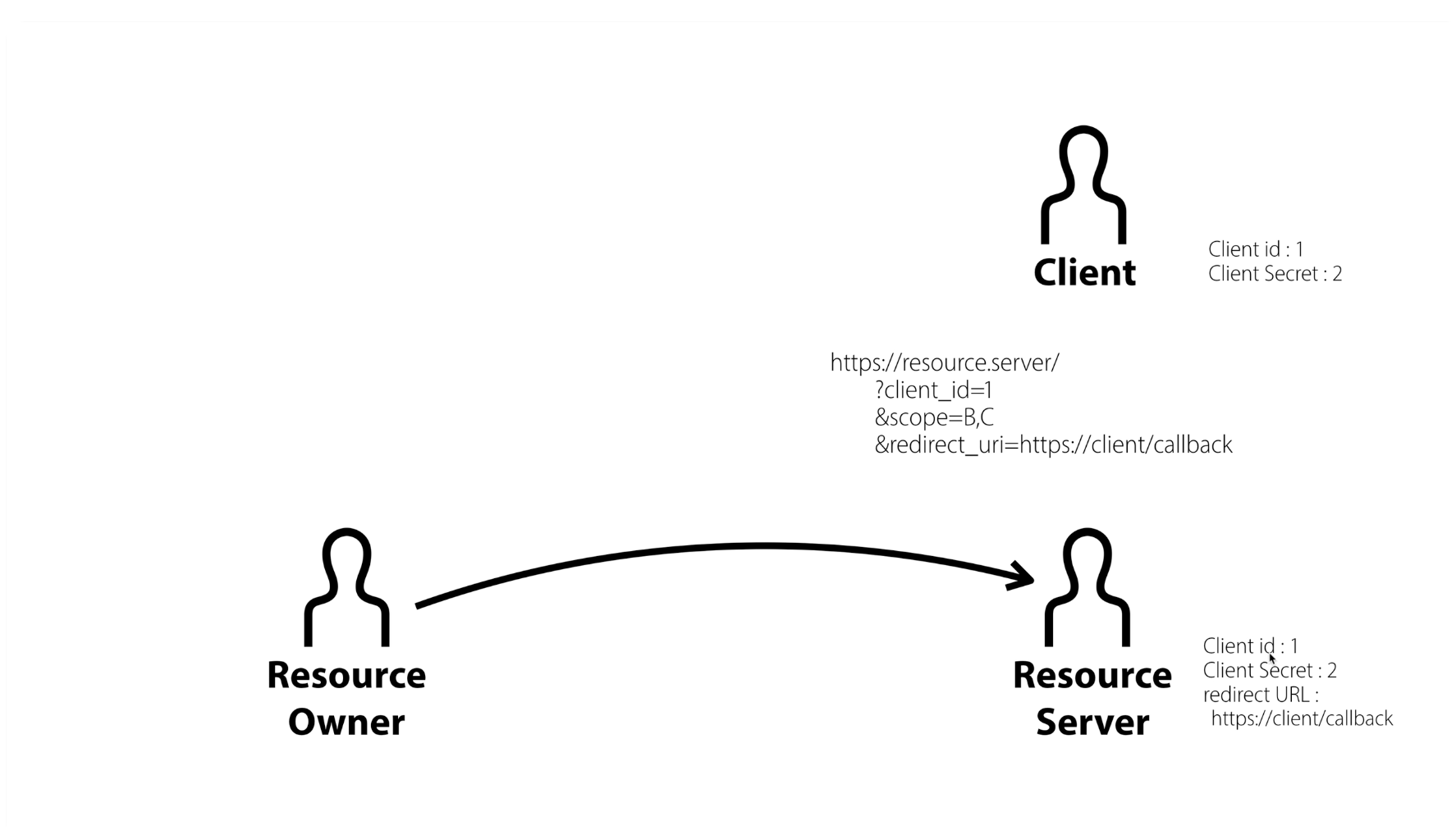 - Access token(like id/pw): Resource server 상에서 resource owner의 고유한 식별자 획득