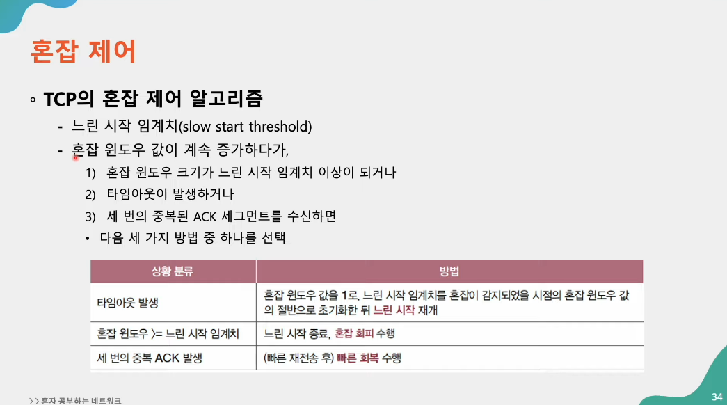 - 흐름 제어의 주체가 수신 호스트라면 혼잡 제어의 주체는 송신 호스트
