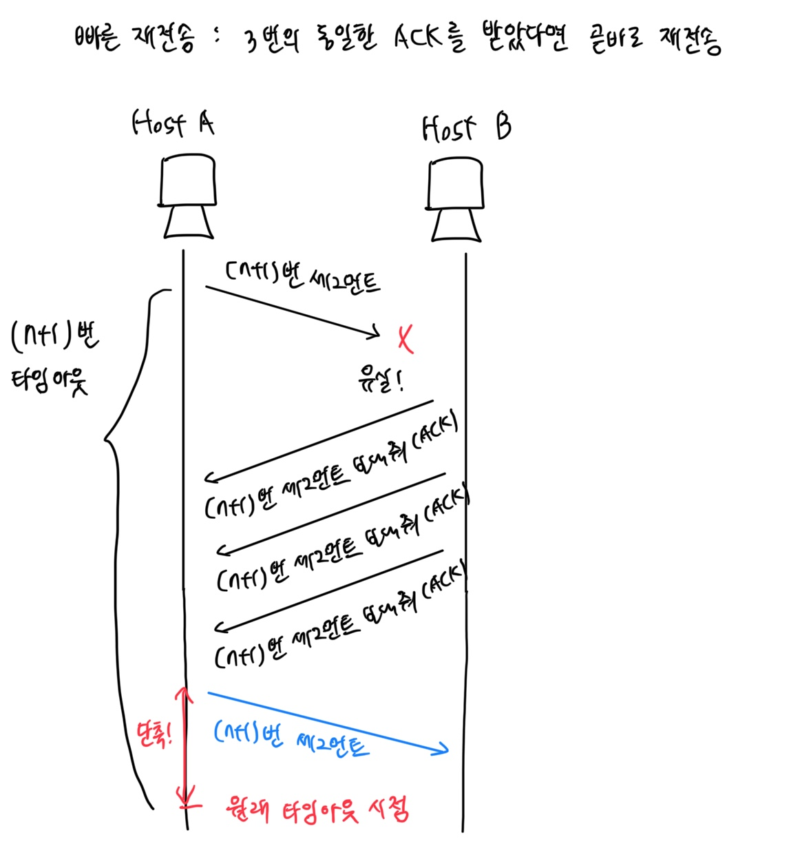 - 재전송 타이머가 만료되기 전이라도 세 번의 동일한 ACK 세그먼트를 받았다면 곧바로 재전송