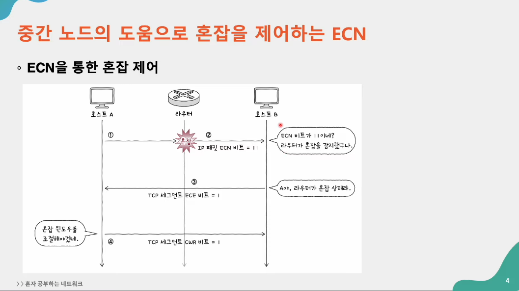 - 그에 반해 ECN은 혼잡을 회피하기 위해 네트워크 중간 장치(주로 라우터)의 도움을 받는다