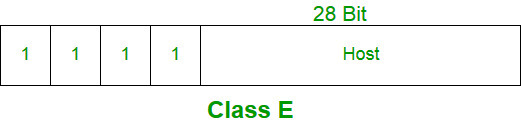 - 클래스 E의 첫 옥텟은 항상 1111로 시작하며, 호스트 주소는 남아있는 28비트로 구성