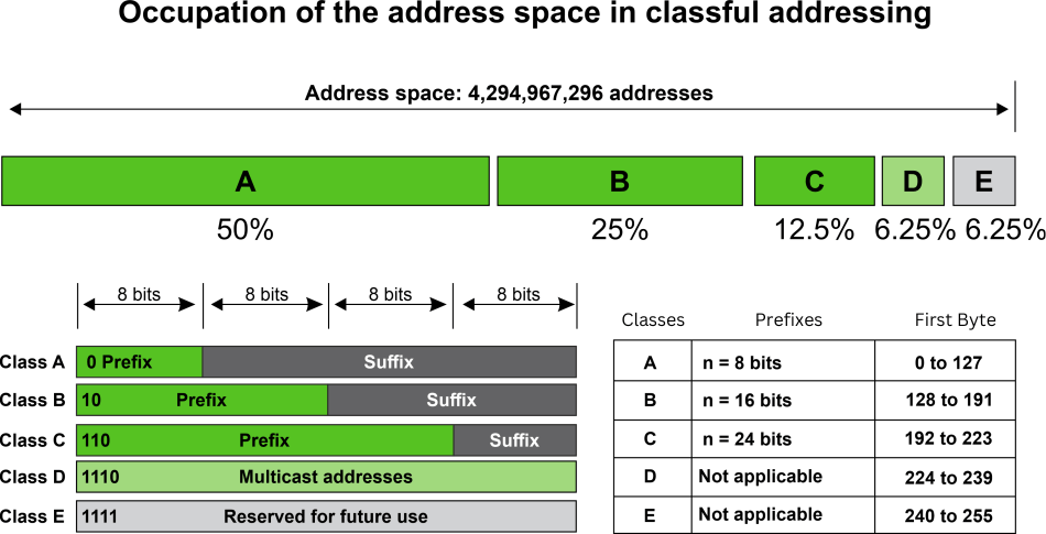 - 클래스풀 주소 체계(Classful Addressing): 클래스 기반으로 IP 주소를 관리하는 주소체계