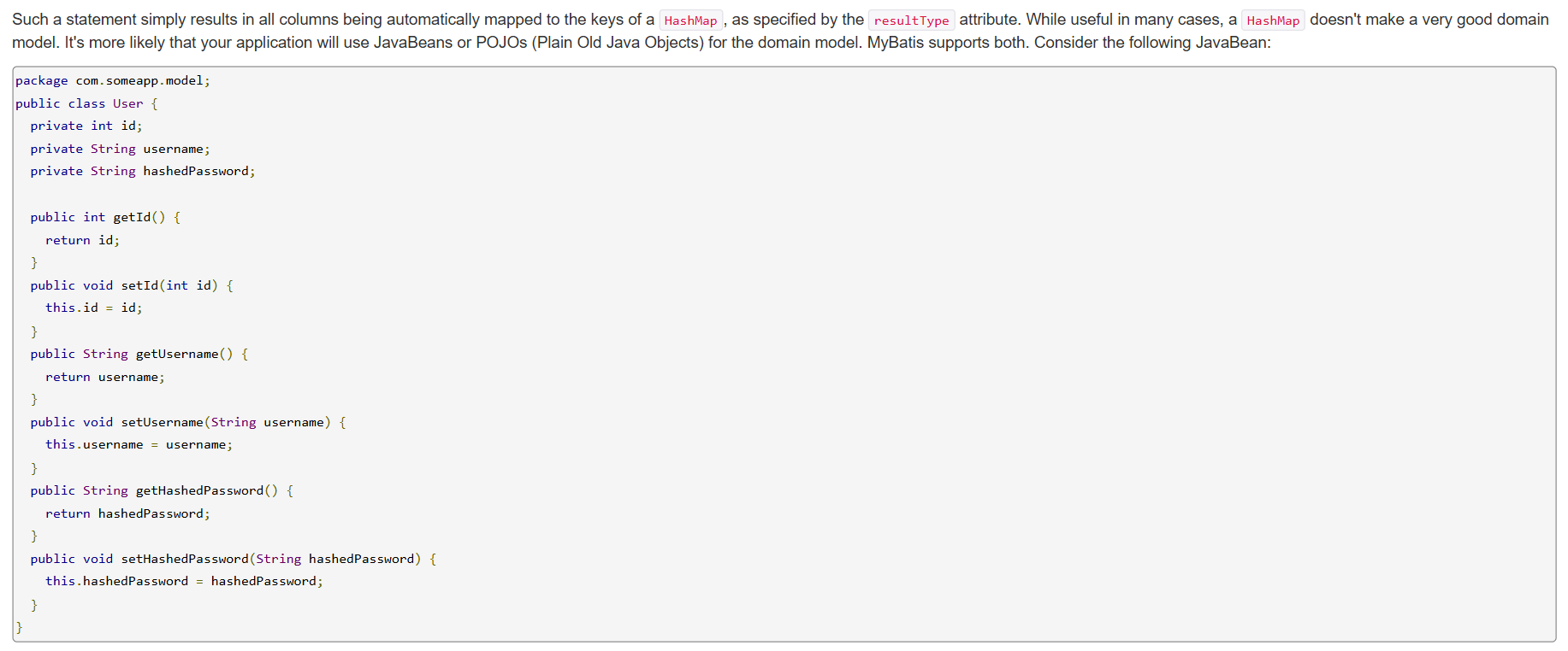 MyBatis 프로젝트를 진행하고 있는데 Dto를 만들면서 기본 생성자 외에 매개변수가 있는 생성자도 같이 적으면 어떤 생성자가 호출되는지 궁금했다. 콘트롤러에서 필요한 필드들을 하나의 객체(dto)로 묶으면서 매개변수가 있는 생성자도 자연스럽게 함께 작성해 줬는데 디버그 문으로 확인해 본 결과 정작 호출되는 것은 기본 생성자였다. 이러한 내용들을 문서에서 확인해 보니 다음과 같았다. 아래는 mapper.xml에서 resultType이 map일 때 반환 객체를 어떻게 생성하는지에 대한 이야기이다. 여기서 'your application will use JavaBeans or POJOs for the domain model...'에서 관련 내용을 확인할 수 있었다. 참고로 MyBatis는 둘 다 지원한..